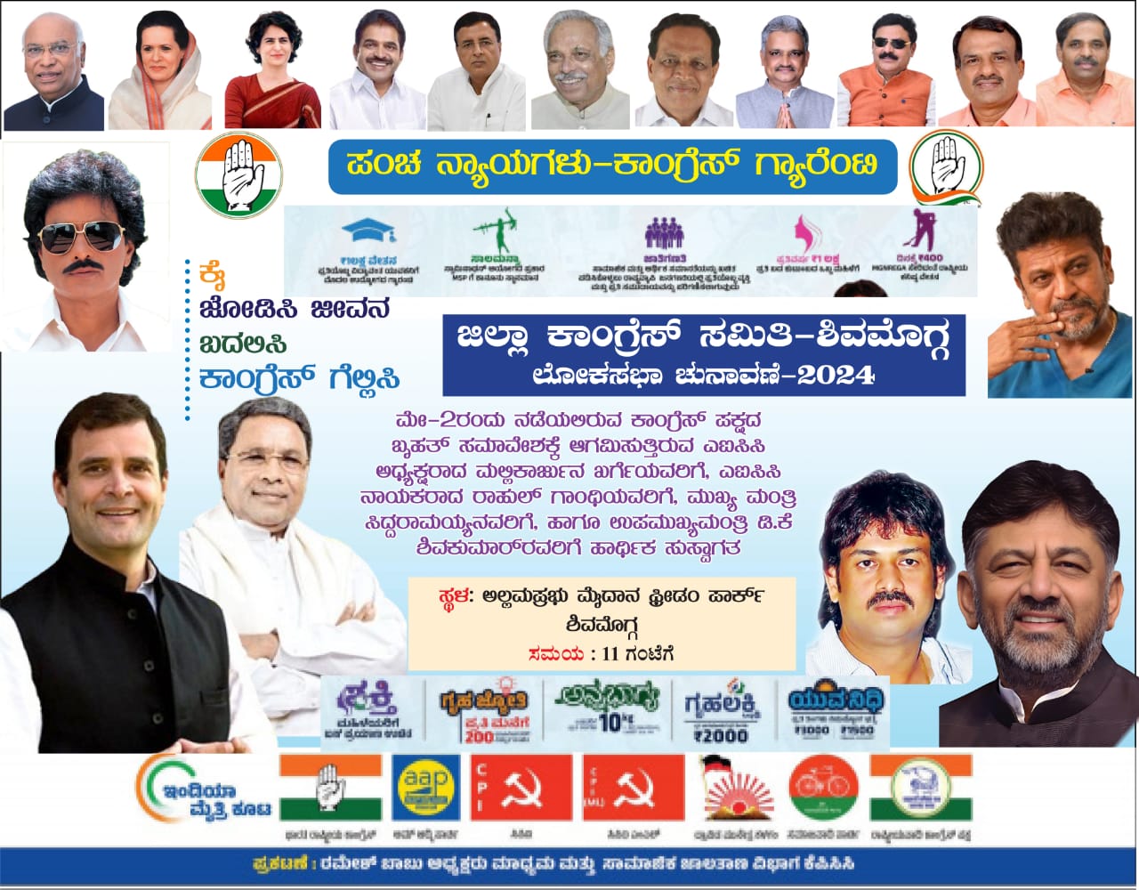 ಶಿವಮೊಗ್ಗ ಲೋಕಸಭಾ ಕ್ಷೇತ್ರದ ಕಾಂಗ್ರೆಸ್ ಅಭ್ಯರ್ಥಿ ಗೀತಾಶಿವರಾಜ್ ಕುಮಾರ್ ಪರವಾಗಿ ಬಹಿರಂಗ ಸಭೆಯನ್ನು ಉದ್ದೇಶಿಸಿ ಎಐಸಿಸಿ ನಾಯಕ ರಾಹುಲ್ ಗಾಂಧಿಯವರು ಮೇ 2ರ ನಾಳೆ ಮಧ್ಯಾಹ್ನ 12ಕ್ಕೆ ಅಲ್ಲಮಪ್ರಭು ಮೈದಾನ (ಫ್ರೀಡಂ ಪಾರ್ಕ್)ನಲ್ಲಿ ಮಾತನಾಡಲಿದ್ದಾರೆ. ಇದಕ್ಕಾಗಿ ಸಕಲ ಸಿದ್ಧತೆಗಳು ನಡೆದಿವೆ ಎಂದು ಜಿಲ್ಲಾ ಉಸ್ತುವಾರಿ ಸಚಿವ ಮಧುಬಂಗಾರಪ್ಪ ಹೇಳಿದರು.