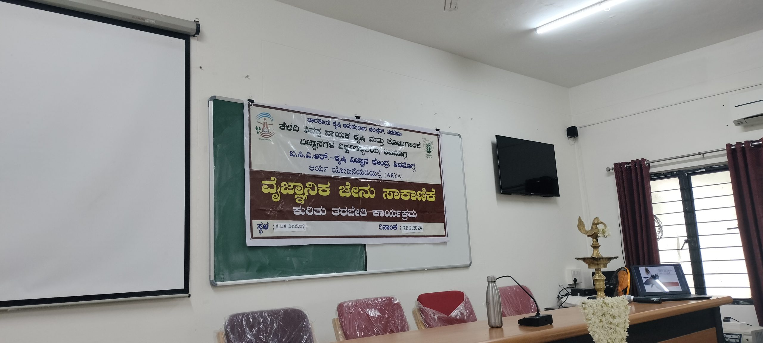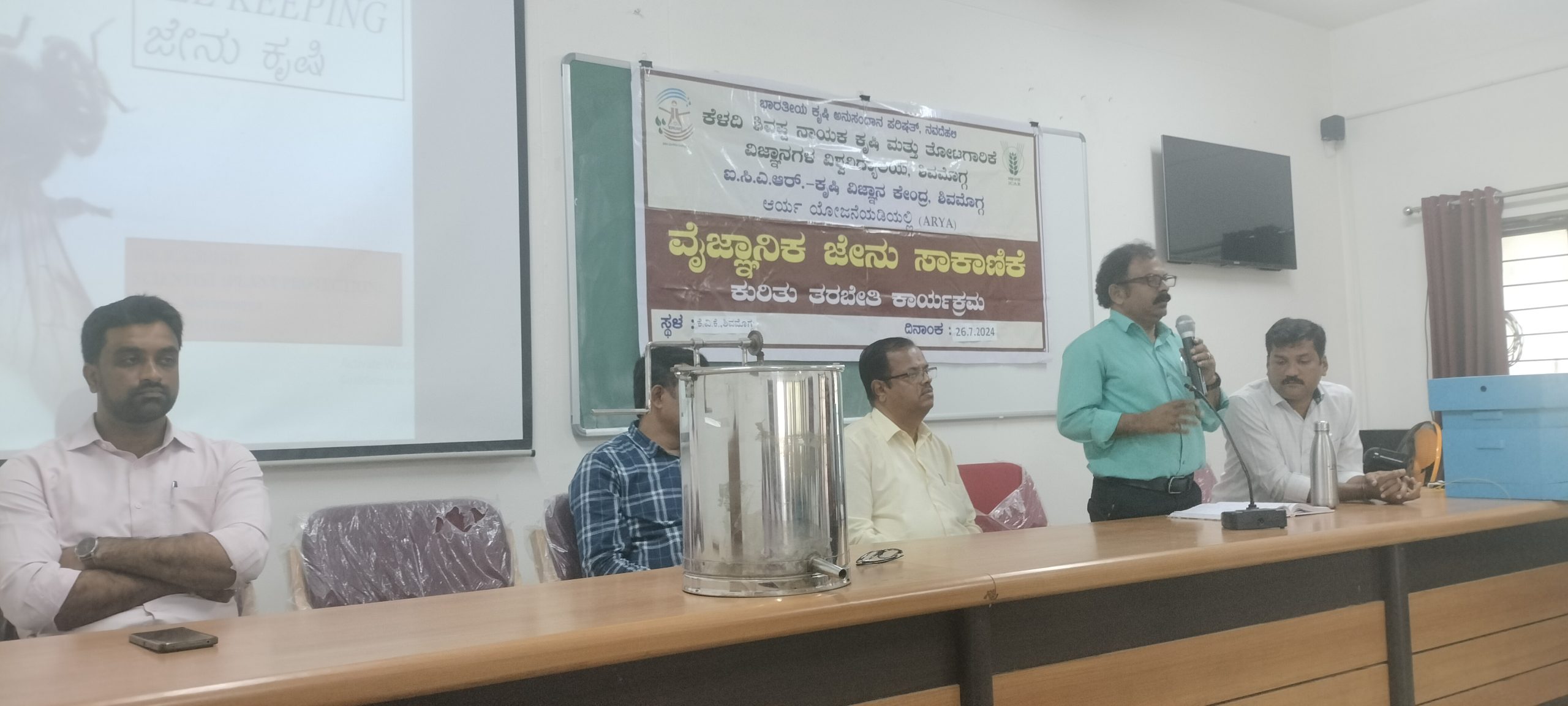 ಐ.ಸಿ.ಎ.ಆರ್- ಕೃಷಿ ವಿಜ್ಞಾನ ಕೇಂದ್ರ, ಶಿವಮೊಗ್ಗ ಇಲ್ಲಿಒಂದು ದಿನದ ಒಳ ಆವರಣ ತರಬೇತಿ ಹಮ್ಮಿಕೊಂಡಿದ್ದು ವೈಜ್ಞಾನಿಕ ಜೇನು ಕೃಷಿ ಕಾರ್ಯಗಾರವನ್ನು ಹಿರಿಯ ವಿಜ್ಞಾನಿ ಬಿ.ಸಿ.ಹನುಮಂತ ಸ್ವಾಮಿ ಸಸ್ಯ ವಿಸ್ತರಣಾ ಅಧಿಕಾರಿಗಳು , ಹಾಗೂ ಸಂಪನ್ಮೂಲ ವ್ಯಕ್ತಿಯಾದ ಡಾ. ಆರ್. ಗಿರೀಶ್ ವಿಜ್ಞಾನಿ (ಸಸ್ಯ ಸಂರಕ್ಷಣೆ) ಅಶೋಕ್ ಎಂ ಪಶು ವಿಜ್ಞಾನಿ, ಡಾ ಜಿ ಕೆ ಗಿರಿಜೇಶ್ ಹಿರಿಯ ವಿಜ್ಞಾನಿ ಹಾಗೂ ಮುಖ್ಯಸ್ಥರು ಇವರ ಸಮ್ಮುಖದಲ್ಲಿ ದೀಪ ಬೆಳಗಿಸುವ ಮೂಲಕ ಕಾರ್ಯಗಾರವನ್ನು ಉದ್ಘಾಟನೆ ಮಾಡಲಾಯಿತು ಕಾರ್ಯಗಾರದ ಉದ್ಘಾಟನಾ ಭಾಷಣವಾಗಿ ಡಾಕ್ಟರ್ ಹನುಮಂತ ಸ್ವಾಮಿಯವರು ಮಾತನಾಡುತ್ತಾ ಜೇನು ಕೃಷಿಯನ್ನು ಐಸಿಐ ಮಾದರಿಯಲ್ಲಿ ವೈಜ್ಞಾನಿಕವಾಗಿ ಯಾವ ರೀತಿ ಜೇನು ಸಾಕಾಣೆ ಮಾಡಬಹುದೆಂದು ಡಾಕ್ಟರ್ ಗಿರೀಶ್ ರವರು ಸಂಪನ್ಮೂಲ ವ್ಯಕ್ತಿಗಳಾಗಿರುವುದರಿಂದ ಹೆಚ್ಚಿನ ವಿಷಯವನ್ನು ತಿಳಿಸುತ್ತಾರೆ. ಹಿಂದೆ ಜನರು ಮಡಿಕೆಯಲ್ಲಿ ಜೇನು ಸಾಕಣೆ ಮಾಡುತ್ತಿದ್ದು ಈಗ ಇದು ವೈಜ್ಞಾನಿಕವಾಗಿ ಬದಲಾಗಿದೆ ಈಗ ಬಿಲ್ಡಿಂಗ್ ಮೇಲೆ ಮನೆಯ ಪಕ್ಕದಲ್ಲಿ ಜೇನು ಕೃಷಿ ಮಾಡಬಹುದು ಶಬ್ದ ಮಾಲಿನ್ಯ ಕಡಿಮೆ ಇದ್ದರೆ ಸೂಕ್ತ ನೀರು ಹಾಗೂ ಹೂವಿನ ಗಿಡಗಳು ಇರುವ ಕಡೆ ಜೇನು ಕೃಷಿ ಮಾಡುವುದು ಒಳ್ಳೆಯದು ಎಂದರು.
