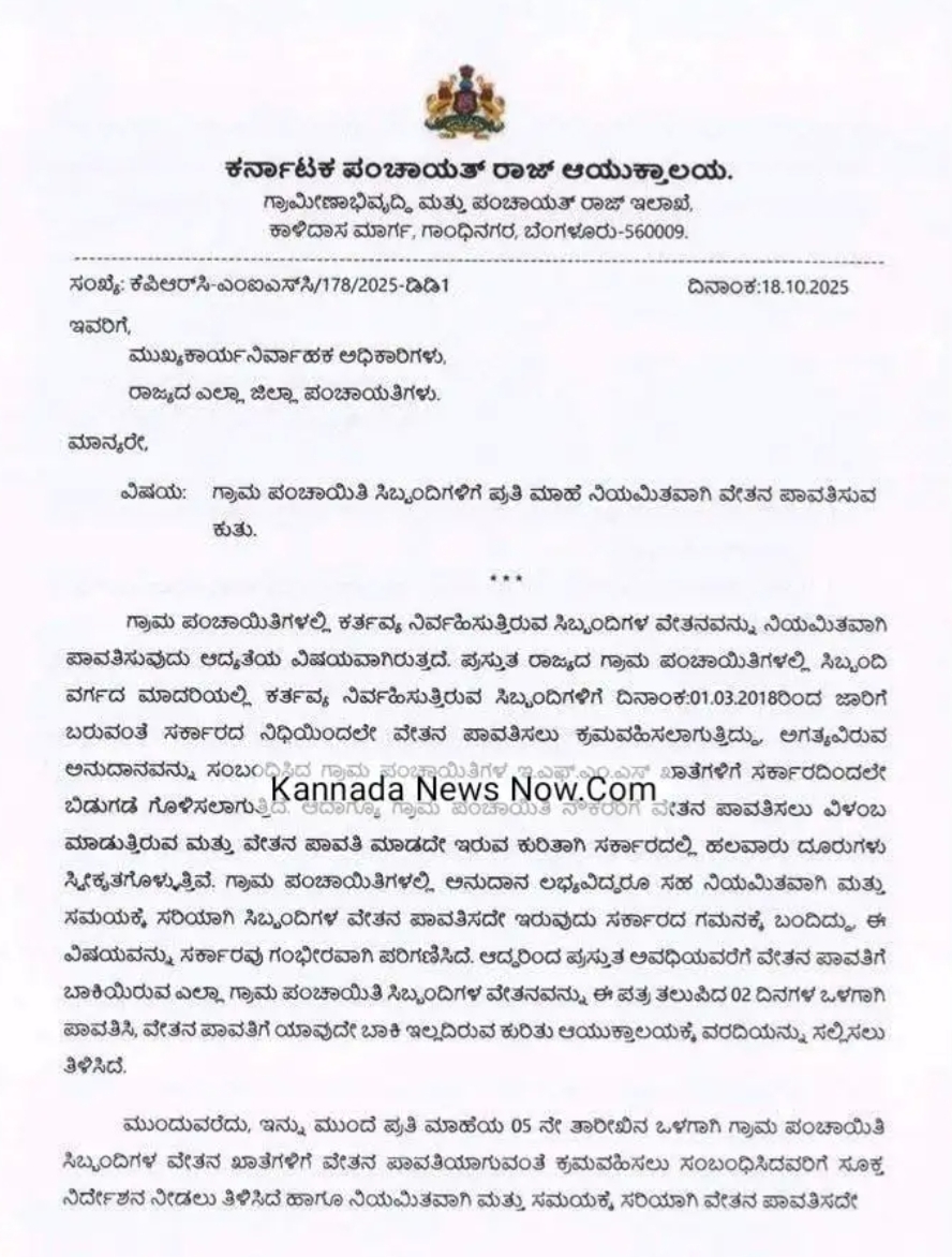 ಆದಾಗ್ಯೂ ಗ್ರಾಮ ಪಂಚಾಯಿತಿ ನೌಕರರಿಗೆ ವೇತನ ಪಾವತಿಸಲು ವಿಳಂಬ ಮಾಡುತ್ತಿರುವ ಮತ್ತು ವೇತನ ಪಾವತಿ ಮಾಡದೇ ಇರುವ ಕುರಿತಾಗಿ ಸರ್ಕಾರದಲ್ಲಿ ಹಲವಾರು ದೂರುಗಳು ಸ್ವೀಕೃತಗೊಳ್ಳುತ್ತಿವೆ. ಗ್ರಾಮ ಪಂಚಾಯಿತಿಗಳಲ್ಲಿ ಅನುದಾನ ಲಭ್ಯವಿದ್ದರೂ ಸಹ ನಿಯಮಿತವಾಗಿ ಮತ್ತು ಸಮಯಕ್ಕೆ ಸರಿಯಾಗಿ ಸಿಬ್ಬಂದಿಗಳ ವೇತನ ಪಾವತಿಸದೇ ಇರುವುದು ಸರ್ಕಾರದ ಗಮನಕ್ಕೆ ಬಂದಿದ್ದು, ಈ ವಿಷಯವನ್ನು ಸರ್ಕಾರವು ಗಂಭೀರವಾಗಿ ಪರಿಗಣಿಸಿದೆ. ಆದ್ದರಿಂದ ಪ್ರಸ್ತುತ ಅವಧಿಯವರೆಗೆ ವೇತನ ಪಾವತಿಗೆ ಬಾಕಿಯಿರುವ ಎಲ್ಲಾ ಗ್ರಾಮ ಪಂಚಾಯಿತಿ ಸಿಬ್ಬಂದಿಗಳ ವೇತನವನ್ನು ಈ ಪತ್ರ ತಲುಪಿದ 02 ದಿನಗಳ ಒಳಗಾಗಿ ಪಾವತಿಸಿ, ವೇತನ ಪಾವತಿಗೆ ಯಾವುದೇ ಬಾಕಿ ಇಲ್ಲದಿರುವ ಕುರಿತು ಆಯುಕ್ತಾಲಯಕ್ಕೆ ವರದಿಯನ್ನು ಸಲ್ಲಿಸಲು ತಿಳಿಸಿದೆ.